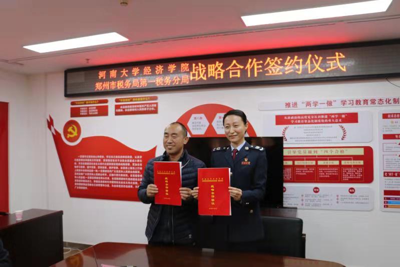 在充满着浓郁党建文化氛围的第一分局“党建之家”,宋丙涛和郑州市税务局第一分局党组书记、局长崔向红在热烈的掌声中签署了战略合作协议,双方确定在今后将共同在大企业税收管理课题研究、员工培养和毕业实习、业务指导培训和学术交流等方面开展合作。宋丙涛表示,通过此次校税合作,有利于夯实公司的办学基础,增强公司的社会服务能力,公司和税务局将共同致力于打造跨界交流和合作共赢的协作平台,探索高校与税务部门协同共赢的机制。双方还就税务理论的学习和实践进行了探讨,并就开展党建工作交换了意见。