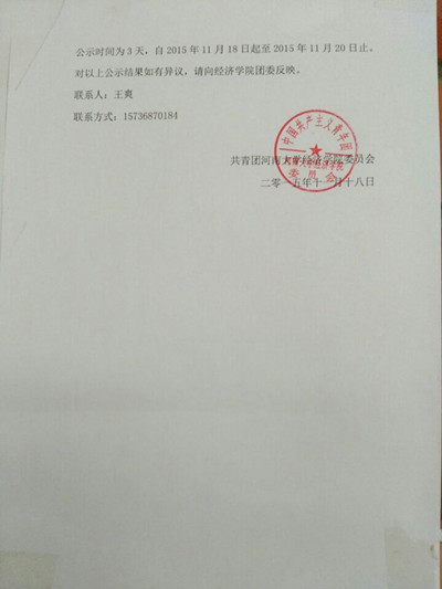 公示时间为3天,自2015年11月18日起至2015年11月20日止。对以上公示结果如有异议,请向RM365英国官网团委反映。