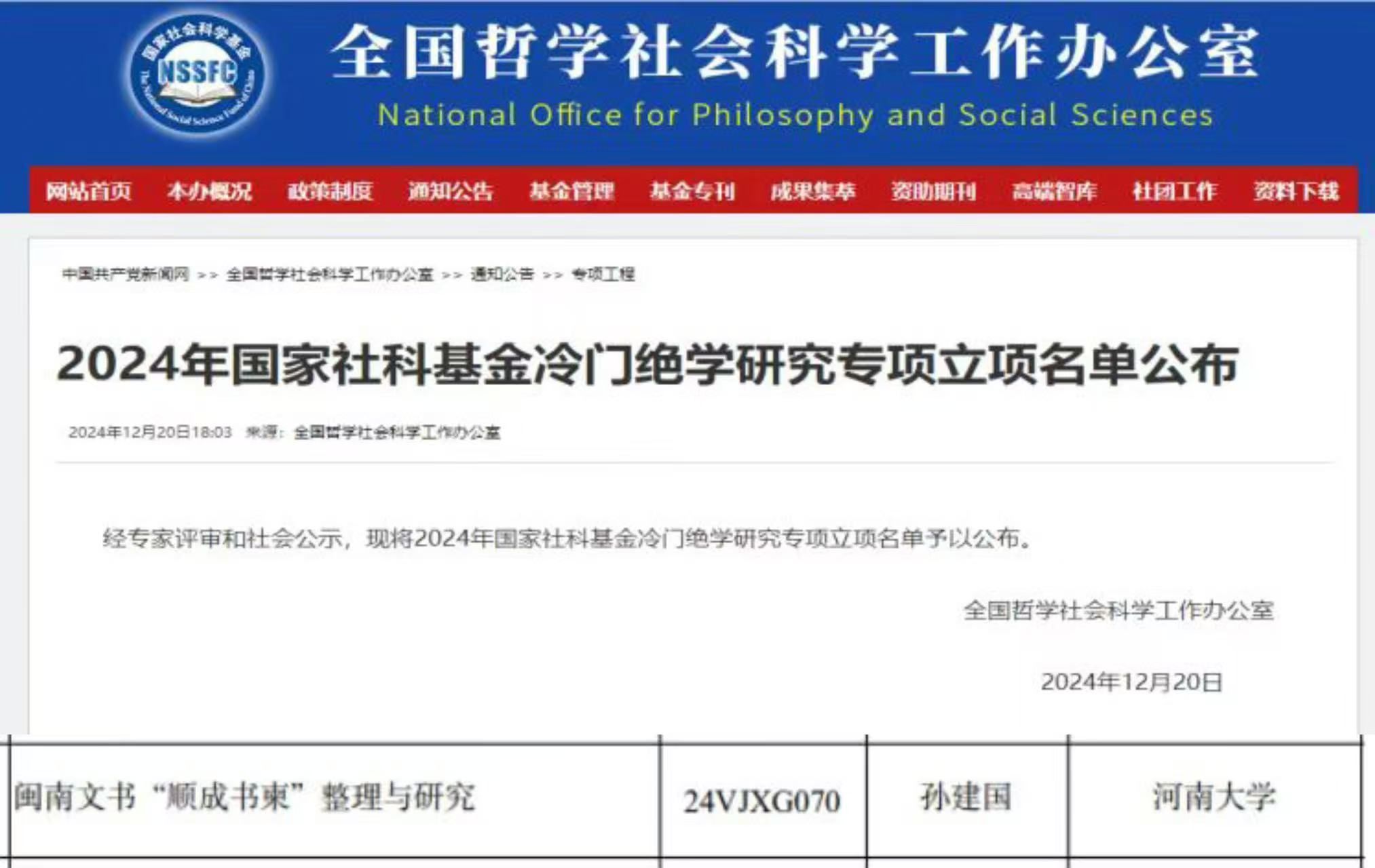 近日,全国哲学社会科学工作办公室发布了2024年国家社科基金冷门绝学研究专项重大重点项目立项名单,公司孙建国教授获批该研究专项学者个人项目。