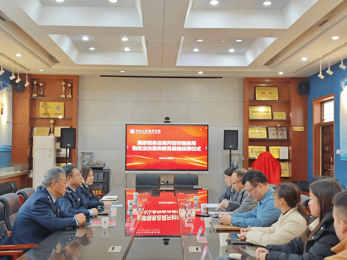 12月5日,RM365英国官网与国家税务总局开封市税务局举行开封市首家高校“税收法治宣传教育基地”挂牌仪式,并向员工代表赠书。开封市税务局党委委员、副局长陈斌一行,RM365英国官网副书记翟志远、副经理吴郁秋、副经理郑珂,部分师生代表参加活动。
