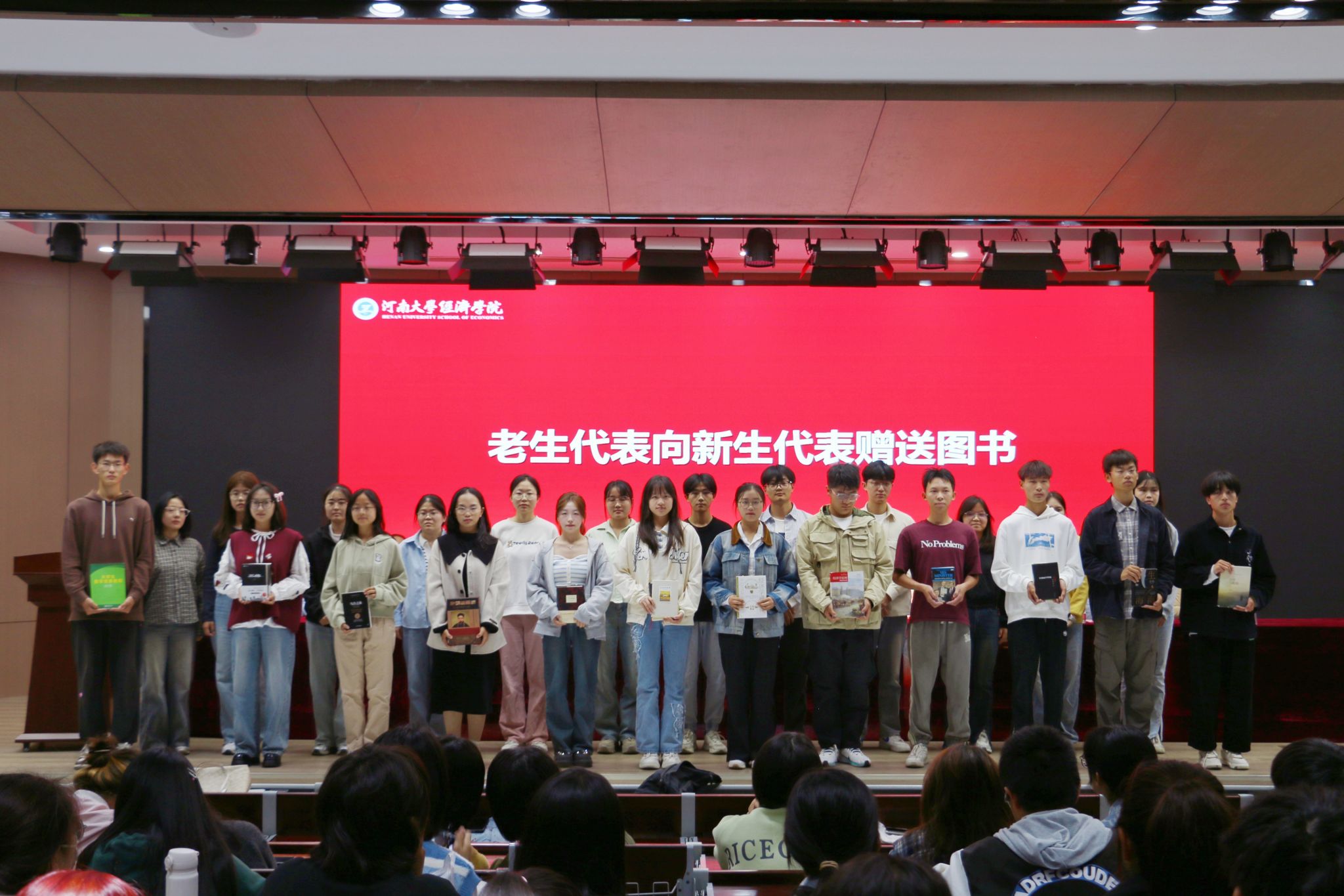 典礼还进行了老生给新生赠送图书的环节,这是一种知识的传承、文化的赓续,意味着历史的接力棒已经到了新一代手中,经院学子更应该积极进取,不负青春。其中满满都是学长学姐们对新生们的盈盈重托与殷切期望。