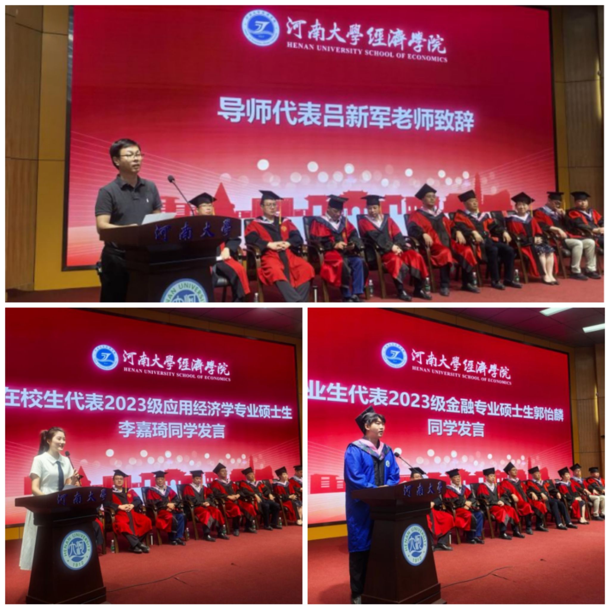 在校生代表李嘉琦向毕业生致以热烈祝贺与崇高敬意,回忆携手钻研学术的点滴岁月,盛赞师兄师姐为前行标杆,立志传承经院精神火种,祝福他们在新征程绽放光彩。