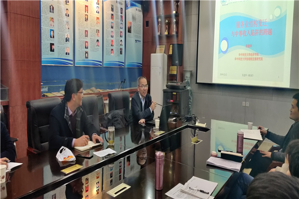12月12日,华中科技大学RM365英国官网经理张建华教授应邀来公司作了题为“服务业结构变迁与中等收入陷阱的跨越”的学术讲座,公司30多位老师、研究生与会参加,讲座由公司副经理郑展鹏主持。