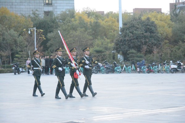 伴随着熹微的晨光,国旗护卫队迈着整齐铿锵的步伐护卫国旗走至升旗台。随着雄壮的国歌声响起,擎旗手奋力挥动手臂,鲜艳的五星红旗向天空舒展开来。冉冉升起的红旗,激昂的国歌声点燃了在场每一个人的爱国之情。升旗仪式结束后,三位同学为大家带来了精彩的朗诵。肖燕南同学首先给大家带来《可爱的中国》,在她声情并茂的朗诵中,一个个有民族情感的中国人仿佛站在在同学们眼前,让同学们感受到军人们保卫中国,为中华民族解放奋斗到底的坚定决心。刘莹莹同学的《何以华夏,何以中国》讲述了“诗书礼仪,探索永恒真理;仁义智勇,谱写慷慨激昂。”最后,国旗护卫队队员孙仪佳同学带大家重温《习近平在北京大学师生座谈会上讲话》。习近平主席的这一番话告诫广大青年要培养奋斗精神,做到理想坚定、信念执着、不怕困难、勇于开拓、顽强拼搏、永不气馁。