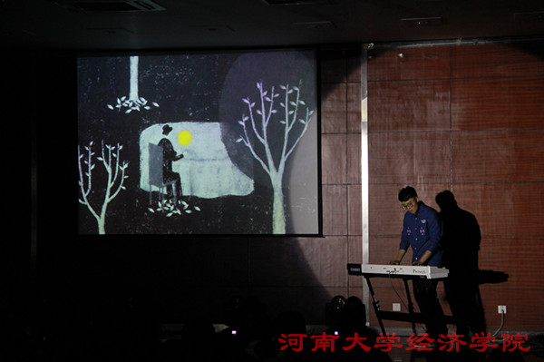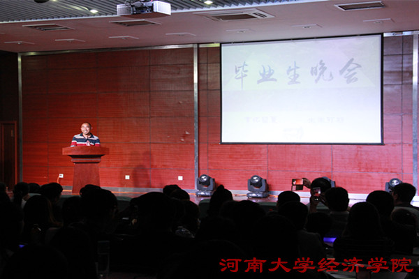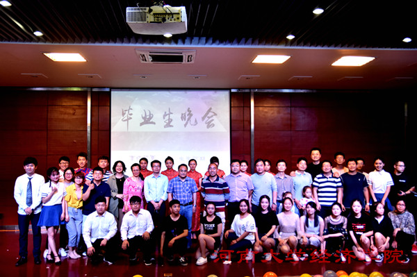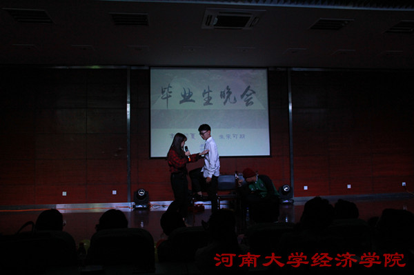 之后晚会正式开始。朱思锜同学刚劲美妙的钢琴曲《克罗地亚狂想曲》引人入胜。 小品《经院偶像团》的演员们以诙谐幽默且极富张力的表演博得观众捧腹大笑;问乐队原创歌曲串烧极具激情和时代感;默剧《梦想的影子》以极富创意的形式展现了河大学子追梦和寻爱路上的酸甜苦辣。 在互动交流环节中,毕业生幽默风趣又不乏深情的追忆了大学四年的点点滴滴,并表达了对学弟学妹的真诚祝福。辅导员老师在同学们的欢呼声中真情演唱了《忘不了》等歌曲,赢得观众们阵阵掌声。精彩的文艺节目以歌曲《年轻的战场》收尾,两位同学的歌声余音绕梁,婉转动听。晚会最后,四位主持人深情朗诵,带领同学们回忆大学四年具有纪念意义的片段,引得师生们眼眶纷纷湿润,晚会也在同学们的回忆和不舍中圆满落下帷幕。