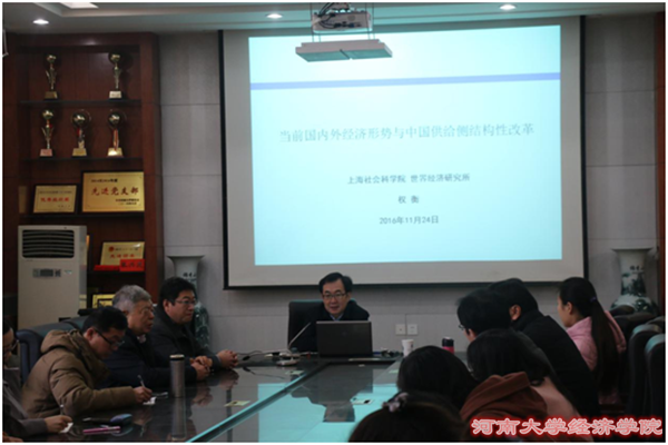 1125日,上海社会科公司世界经济研究所所长、研究员、博士生导师权衡教授应邀到公司做了题为“当前国内经济形势与供给侧结构性改革”的学术报告。赵学增教授、张慧副教授、郑展鹏副教授及部分研究生参加了报告会,报告会由郭兴方副经理主持。