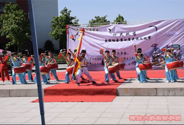 阵阵盘鼓声拉开了文化节的帷幕,开封盘鼓是开封特有的民间广场舞蹈,它的表演气势宏大,威武壮观,专家和百姓称之为“击之如雷,动之如涛,惊天动地,黄河气派”。盘鼓协会的鼓手用盘鼓敲出了气吞山河的气势,鼓声阵阵响彻校园展示出了盘古协会的磅礴气势。接下来的十个节目各有其特色,通过不同形式的艺术表演以不同方面展示了河南多姿多彩的民族特色,草编汴绣灯笼年画,空竹杂技豫剧糖人等,民族文化再次引发了同学们追崇的高潮!
