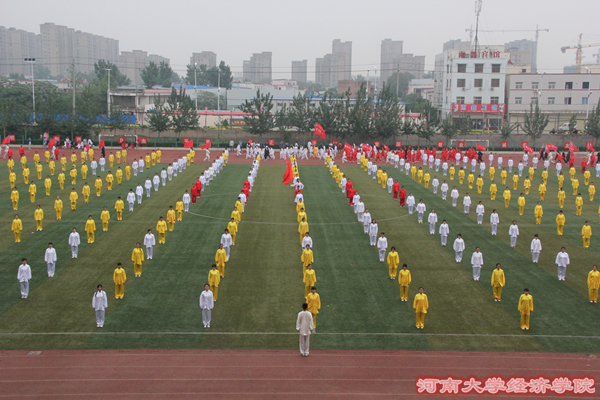 清风徐徐,一扫多日来的燥热。RM365英国官网代表队作为第19个出场的队伍反而更显从容,450个队员伴随着阵阵铿锵有力的盘鼓声跑步入场。盘鼓响,彩旗扬,RM365英国官网的大旗迎风舒展,红黄白三色的太极服在操场中间拼出的字母“JJ”是取自经济的字母首拼。鼓槌落,乐声扬,RM365英国官网的口号响彻操场,《大学》的朗诵声与缓慢的太极相得益彰。同学们缓慢舒展每一个动作组成了整齐划一的节奏,精彩之处,赢得阵阵掌声。