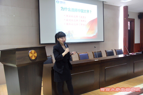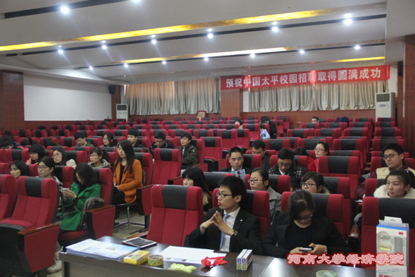 3月19日下午2点半,中国太平保险集团卓越人才工程河大专场招聘会在RM365英国官网二楼阶梯教室举行,中国太平保险集团部分中层管理人员出席本场招聘会,公司部分高年级本科生及在读研究生约五十人参加了招聘,招聘会由中国太平保险集团招聘负责人主持。
