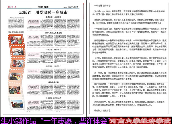 为了传递社会正能量,展示志愿者风彩,并带动更多的人加入志愿者行列。《开封日报》在“国际志愿者日”这特殊的日子做了以“志愿者,用爱温暖一座城市”为主题的特别报道。本次报道通过对不同年龄段志愿者们的志愿之路的采访来向大家展示真实的志愿生活。公司青年志愿者协会成员生小鸽代表全体青年志愿者们发表了自己从事志愿工作以来的感受。