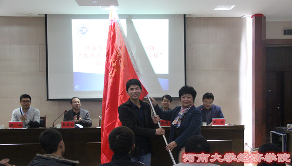 王凌将班旗郑重授予“青马班”班长李海阳,RM365英国官网第一期“青年马克思主义者培养工程”培训班正式开班。