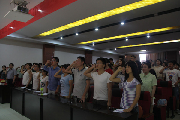 在庄严的国歌之后,赵红磊宣读本次过政治生日的16名员工党员名单。随后这16名同志围绕“当初入党为什么,现在为党做了什么,将来给党留下什么”为主题发表生日感言,向党组织汇报了一年以来思想、学习、工作方面的情况,并庄严地重温了入党誓词。王桂、赵红磊、郭艳艳为这16名同志赠送生日贺卡和党建读本,鼓励他们在今后的学习与工作中,时刻牢记党的宗旨和使命,永葆共产党员的先进性。鲜红的党旗下,一声声慷慨激昂的宣誓,一张张“炙手可热”的政治生日贺卡,使与会的每一位党员心潮澎湃,感慨万千。
