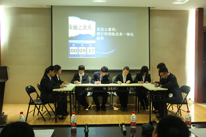活动在播放选手们的个人风采视频中拉开序幕。比赛正式开始后,选手按组登台自我介绍。决赛分为三轮,第一轮为风采展示,八位选手分为两组,依次登台以ppt讲演方式展示自己小组对金融问题的调研成果,随后评委老师针对各小组的ppt展示进行了提问。第二轮为金融之我见,八位选手对于给定的金融话题(怎样看待银行和保险业务一体化趋势),进行了头脑风暴式的讨论。第二轮结束后,主持人走下舞台与观众进行了近距离的互动,向观众提问金融知识,并为观众送上了精美礼品,现场观众踊跃参与。第三轮为模拟招聘,每位选手都与评委老师进行了互动问答。之后为初级组获奖选手颁奖。高级组成绩公布之前,特邀嘉宾李帅先生和郝晓轩先生应主持人和观众的邀请上台展示歌喉并和观众交流。随后,嘉宾为高级组选手颁发获奖证书,嘉宾和获奖选手合影留念。