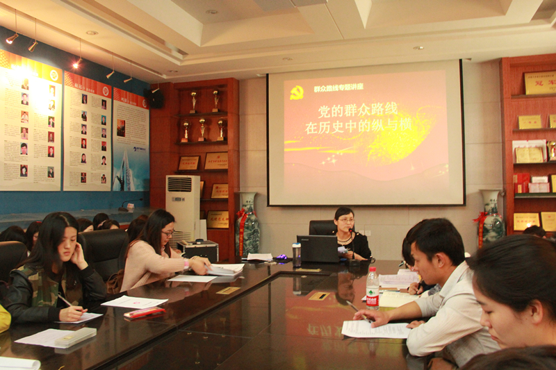 郭艳艳重点向党员们分享了自己在学习党的群众路线教育实践活动时的思考与感悟,以PPT的形式生动形象的为大家开展了一场具有深刻意义的讲座。她用贴切生动的图片让全体党员了解了“照镜子、正衣冠、洗洗澡、治治病”的总体要求,并以此还原党员干部的本色,对症下药最终达到为人民服务的正确价值取向。随后,郭艳艳详细介绍了党的群众路线的内容、形成与发展的五个阶段,明确了党的群众路线教育实践活动的开展具有深刻的历史意义、现实意义与教育意义。在结合自己学习党的群众路线时对传统“民本思想”的思考,郭艳艳细致阐述了民本思想的内容与发展历程,提出党的群众路线观点是对传统的“民惟邦本”思想的继承与发展,但二者在根本目的、立足点、关系定位等方面是截然不同的。最后,在总结党的群众路线对我们当代老员工的启示时,她指出我们要坚信群众的力量是巨大的,是推动社会发展的决定性力量,并引用唐代柳宗元的一篇序文《送薛存义》强调:党员干部为人民服务不是对群众的恩赐,而是人民用自己的劳动所得聘请来为群众主持公道的,是人民赋予的职责。同时,她鼓励青年老员工党员要从思想上与行动上积极主动的深入基层,走进群众,深入群众,向群众学习,树立吃苦意识,在同学中发挥表率作用。