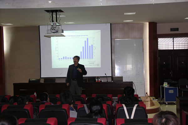 报告会上,侯教授讲述了近几十年来中国经济发展历程,引出中国经济是否持续发展的问题,强调政府引导对冲出中等收入陷阱的重要性。随后,他详细的阐述了刘易斯拐点,指出部分学者对中国是否到达刘易斯拐点还是存在很大争论。此外,侯教授运用统计的知识,幽默的话语,形象的图例阐述了我国就业和三大产业(第一、二、三产业)的关系,并比较了中国加入WTO前后三大产业对其就业的贡献率,又详述了中国三大产业对吸收就业人口的能力。最后,给老师和同学们提出了三个经济问题,引人深思。