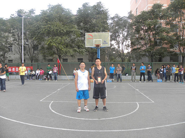 趣味投篮技巧大赛,11级员工丁远以投中6个球荣获第一名,左经理为其颁发荣誉证书。正式比赛中6支队伍激烈角逐,最终教师队以56:20战胜大一财经保队,大三队以40:39的一分优势险胜大一金融队,而大一国统队以39:52不敌大四队。
