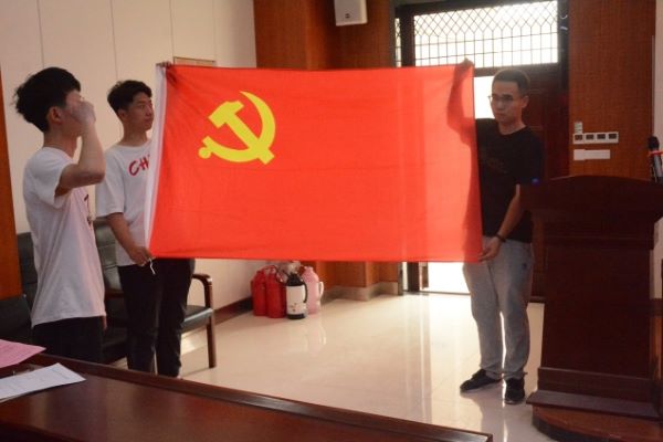 本科毕业生党员代表宋飞燕带领全体党员重温入党誓词,与会党员举起右拳,面向党旗郑重宣誓。