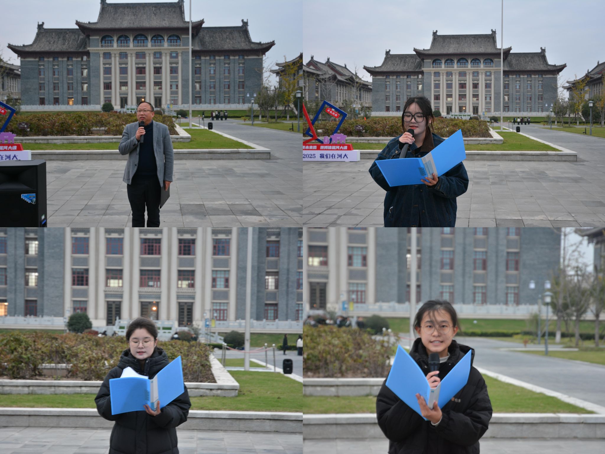 升旗仪式后,2025级员工代表邢瑀夏、2024级员工代表兼年级团支书王怡然、2023级员工代表兼院员工会主席刘铭依次登台,以当代河大学子的鲜明视角传递理想信念与青春担当。他们结合校园飞檐斗拱的建筑风貌、冯友兰“阐旧邦以辅新命”等先辈精神、赵九章科技报国情怀,及公司从抗战辗转办学到“双一流”建设的发展历程,深刻诠释身为河大学子的使命与荣光;同时提出以爱国情怀为内核,在学习中践行“格物致知、修身为本、身体力行、薪火相传”,并以“明德新民、止于至善”校训为指引,呼吁同学们珍惜大学时光,以勤勉求知的姿态、扎实过硬的本领践行“崇德尚能,经世济民”院训,在“两个一百年”奋斗目标历史交汇点上,用实际行动书写不负自我、不负母校、不负新时代的成长答卷。