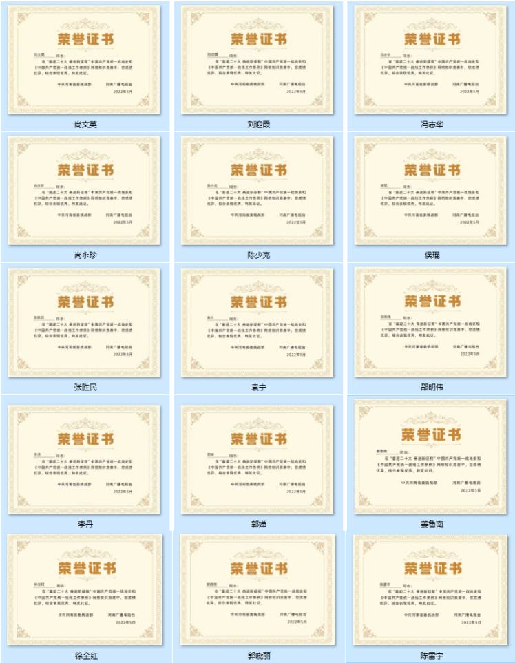 为深入学习宣传贯彻习近平新时代中国特色社会主义思想、习近平总书记关于加强和改进统一战线工作的重要思想,引导和调动广大党员、民主党派成员及全体师生在浓厚党史、统战史学习氛围中迎接党的二十大胜利召开,5月28-29日,财政系党支部组织党的统一战线理论学习。财政系党支部全体党员教师、民主党派教师和无党派教师全部参加学习活动,并参加省委统战部组织的“喜迎二十大 奋进新征程”中国共产党统一战线史和《中国共产党统一战线工作条例》网络知识竞赛,成绩斐然,财政系15位老师综合表现全为优秀,均获得中共河南省委统战部和河南广播电视台颁发的荣誉证书。