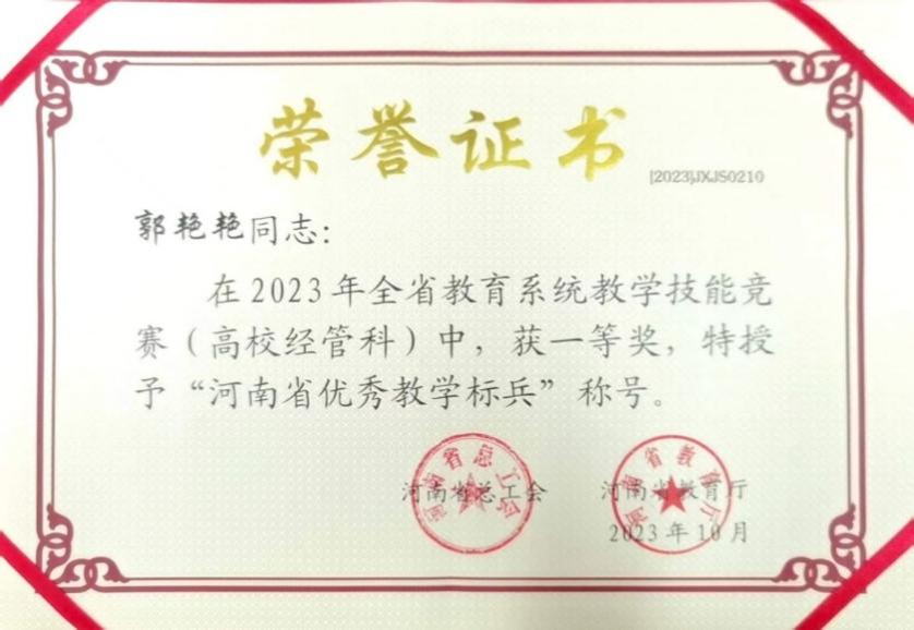 10. 公司1名教师获得河南省教育系统教学技能竞赛一等奖,并被授予“河南省优秀教学标兵”荣誉称号,进一步凸显公司教师专业化水平和教学创新能力。