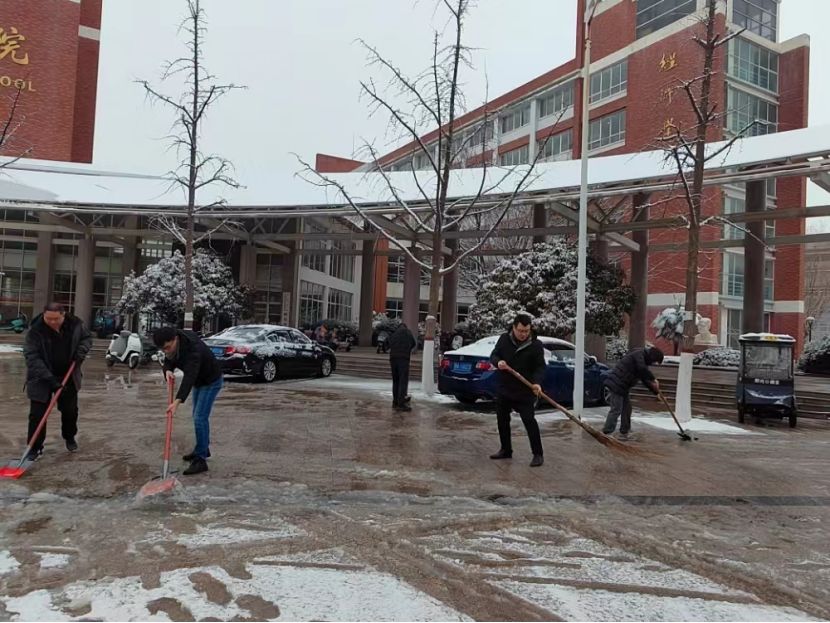 数十位老师手握扫把、除雪铲,铁锹等工具,尽心尽力清理责任片区内积雪,忙碌的身影构成了冬日里一道亮丽的风景线。虽然寒风凛凛,但热火朝天的劳动场面让严寒的天气显得暖意浓浓,经过一个多小时的努力,清出了一条条“绿色安全通道”,有效消除了积雪带来的安全隐患为师生出行安全保驾护航