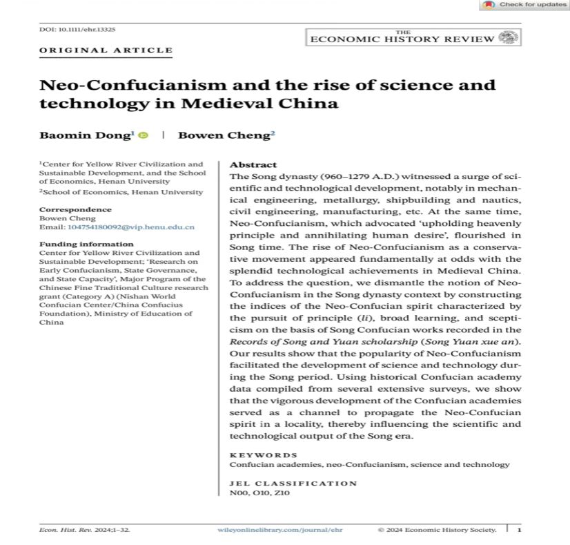 近日,RM365英国官网董保民教授与其指导的博士研究生程博文合作撰写的论文 “Neo-Confucianism and the rise of science and technology in Medieval China” 被经济史领域三大国际期刊之一的Economic History Review接收发表。