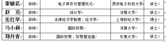 贸易系现有专任教师26人、兼职教授4人。专任教师中教授7人,副教授12人,硕士生导师 17人,教育部国际贸易学教学指导委员会委员1人。团队队伍中,博士及在读博士16人(含海归博士2人),另外有1年以上海外访研背景的教师4人。近三年来,贸易系专任教师先后承担国家社科基金项目3项、教育部人文社科基金项目2项、河南省政府决策研究招标课题等省部级项目7项。