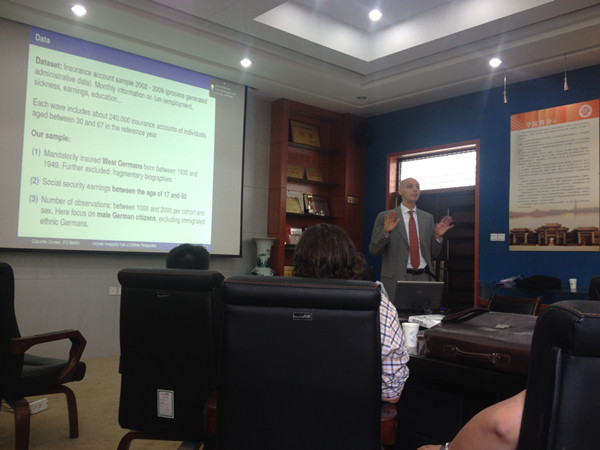 在研讨会上,Prof. Corneo从一个新的视角即寿命的角度来探索收入不平等问题。首先提出在不同的社会年代,人的一生所能获得的社会商品和福利有所不同,并以此为基础来探求在不同的生命周期中是何种因素导致年度收入的不平等。通过假设和数据图表分析,最终得出60-80%的终身不平等的增加是由队列内特定工资的不平等增加导致的。