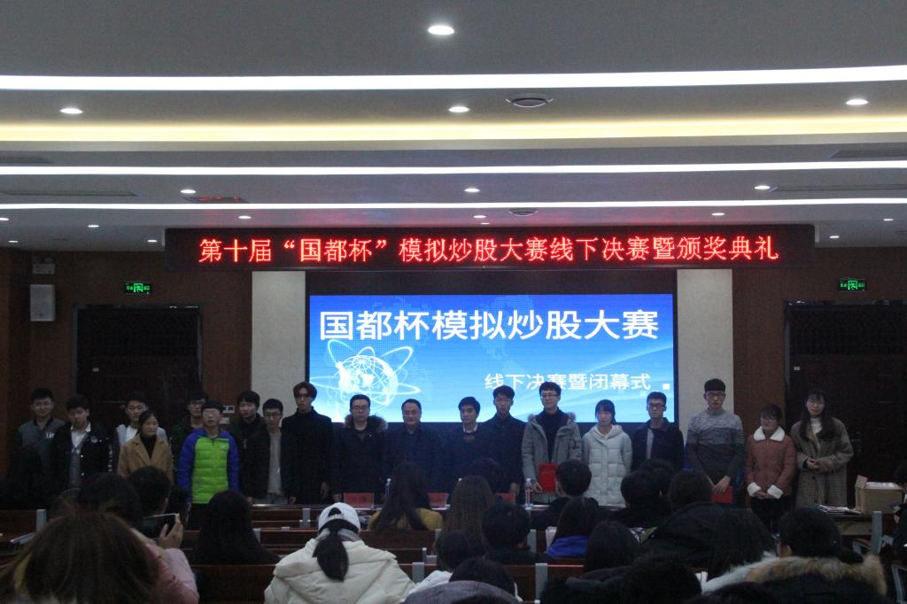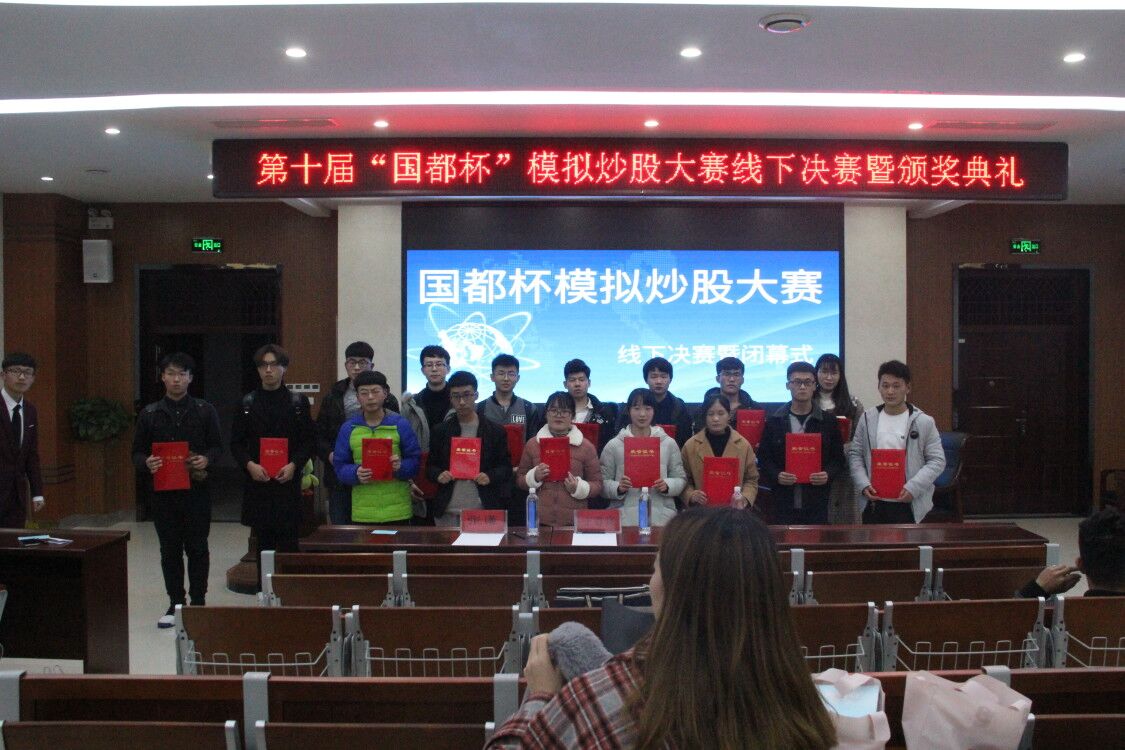 自11月16日开幕式以来,全校各公司共有一千多名选手报名参赛。线上比赛是基于一种虚拟的平台来实现股票买卖。同时,模拟股票的行情完全与交易所同步,且交易是T+1制度。选手们通过找寻根源,长远分析股票以获取收益。最终线上比赛依据收益率进行排名。线上比赛的前十六名选手凭借高收益率脱颖而出。他们在今晚的比赛中参与了从紧张激烈的抢答题,到体现知识储备的必答题,再到最终展现个人应变和口才的陈述题三个层层深入的答题环节。最后闫浩杰同学拔得头筹,获得了此次“国都杯”模拟炒股大赛线下决赛的第一名。其他参赛选手也是实力强劲,表现突出,取得了不错的成绩和排名。王春晓、张谦和刘子超分别为获奖同学颁发了荣誉证书。