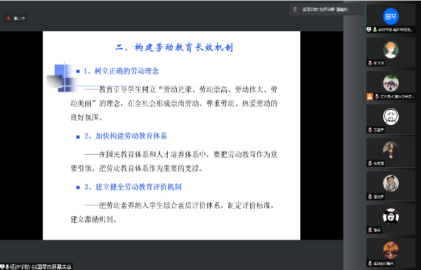 姚国琴老师以马克思主义劳动观为切入点,围绕“劳动教育观”和“劳动价值观”展开讲解。姚老师首先谈到劳动的内涵,劳动应该是自由的、自主的、本真的、全面的劳动,只有劳动解放,才能够实现人类的解放。姚老师指出,为倡导和践行科学的劳动价值观,要倡导正确的劳动价值取向,要弘扬劳动精神、职业精神和奉献精神,要践行科学的劳动价值观。她希望各位同学都能够成为辛勤劳动、诚实劳动、创造性劳动的践行者和社会主义事业的建设者。
