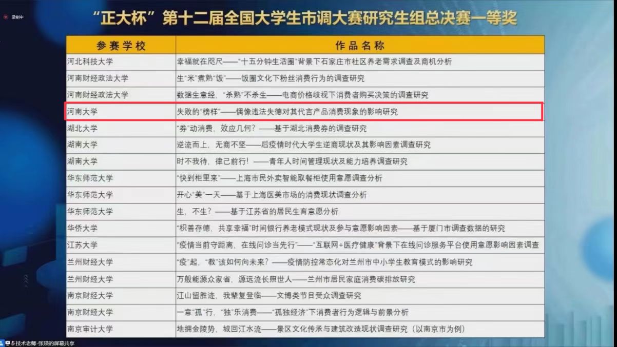 公司有1支队伍参加了现场答辩并取得研究生组国家一等奖的优异成绩,是2021级研究生张莹丹、邱沣、胡亚、张玮橦、李猛的作品《失败的“榜样”——偶像违法失德对其代言产品消费现象的影响研究》,指导老师为刘飞。此外,公司另有4支队伍获得了国家三等奖,分别是2020级谢冰、王彪、王素、高晓锦、刘梦瑶的作品《“华夏之源,匠心独运”——河南卫视“奇妙游”系列文化节目传播效果调查研究》,指导老师为曹玉平;2020级研究生张飞鸿、李曼彤、李欣兰、范雪瑶的作品《从嫌弃到真香,现代人新宠?——临期食品认可度与市场前景探究》,指导老师为李晓敏;2020级李梦瑶、刘杰、王岩岩、蓝斌莲、杨帅通的作品《三孩,想说爱你容易吗 ——基于开封市育龄女性的调查研究》,指导老师为张晓芳;2021级研究生赵学智、张清峰、孙嘉聪、马晨晨的作品《有“钱景”,小家政大民生——郑开地区家政业供给与需求的调查研究》,指导老师为杨校美。